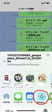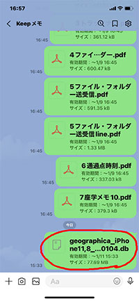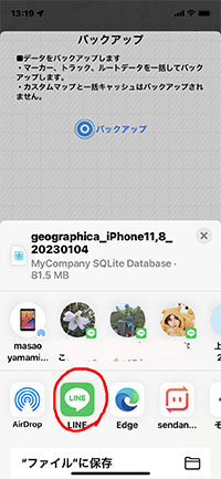 そこで、貴方の友達から「Lineのトーク」で、Geographicaのバックアップファイル=・・・.db形式のデーターを送られたものをご自分のジオグラヒカ に取り込む方法を説明します。