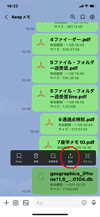 [14].送られた側は左図のようになります。 [13]で、ご自分の「Line」の「Keepメモ」を選択して、Backup Dataを残すこともできます。この場合、有効期限があるので、再度、有効期限のない所に転送してください。