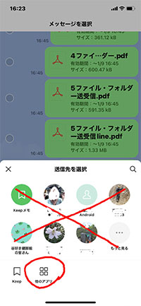 [4].左図のようになるので、「他のアプリ」をタップします。 「他のアプリ」をタップして、Geographicaが現れない機種はこの方法では取り込めません。特にAndroidの機種ですが、iphonは一括取り込みができています。 |
